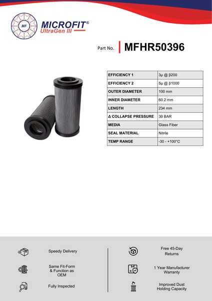 Genuine MicroFit® UltraGen III MFHR50396 filter. Engineered and manufactured in Great Britain the MFHR50396 is designed to meet or exceed the quality and performance of OEM quality standards, ensuring superior filtration performance and the longest possible filter life.Building on over 50 years of filtration expertise, the UltraGen III series is the third generation of MicroFit® filter media, delivering exceptional efficiency and reliability.