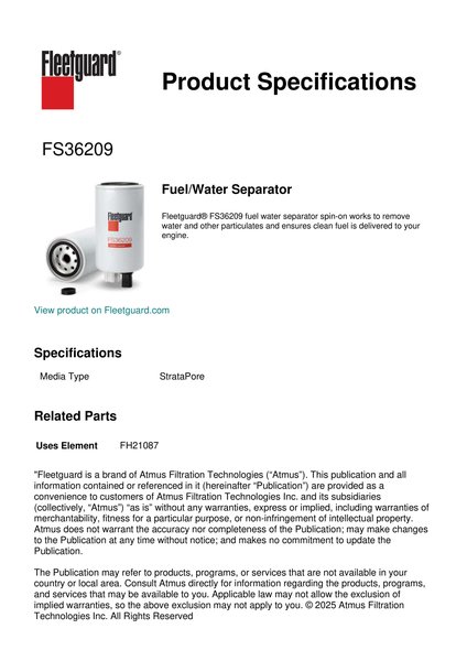 Fleetguard® FS36209 fuel water separator spin-on works to remove water and other particulates and ensures clean fuel is delivered to your engine.