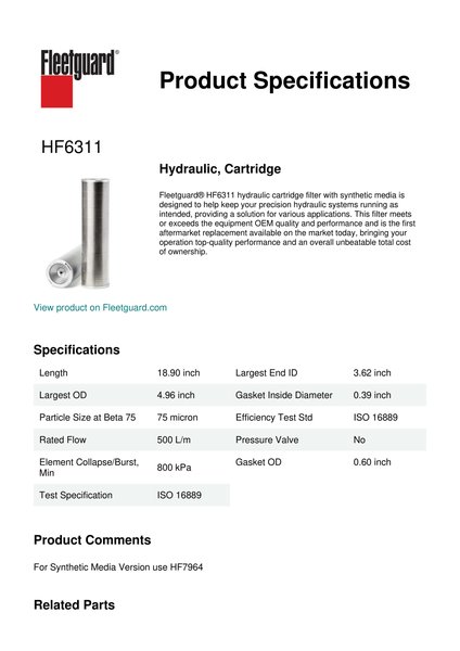 Fleetguard® HF6311 hydraulic cartridge filter with synthetic media is designed to help keep your precision hydraulic systems running as intended, providing a solution for various applications. This filter meets or exceeds the equipment OEM quality and performance and is the first aftermarket replacement available on the market today, bringing your operation top-quality performance and an overall unbeatable total cost of ownership.Specification