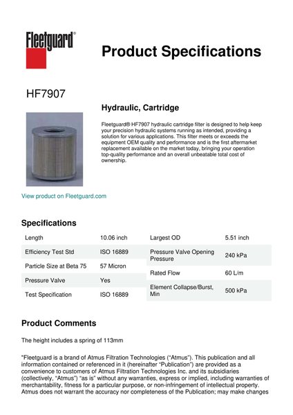Fleetguard® HF7907 hydraulic cartridge filter is designed to help keep your precision hydraulic systems running as intended, providing a solution for various applications. This filter meets or exceeds the equipment OEM quality and performance and is the first aftermarket replacement available on the market today, bringing your operation top-quality performance and an overall unbeatable total cost of ownership.Specification