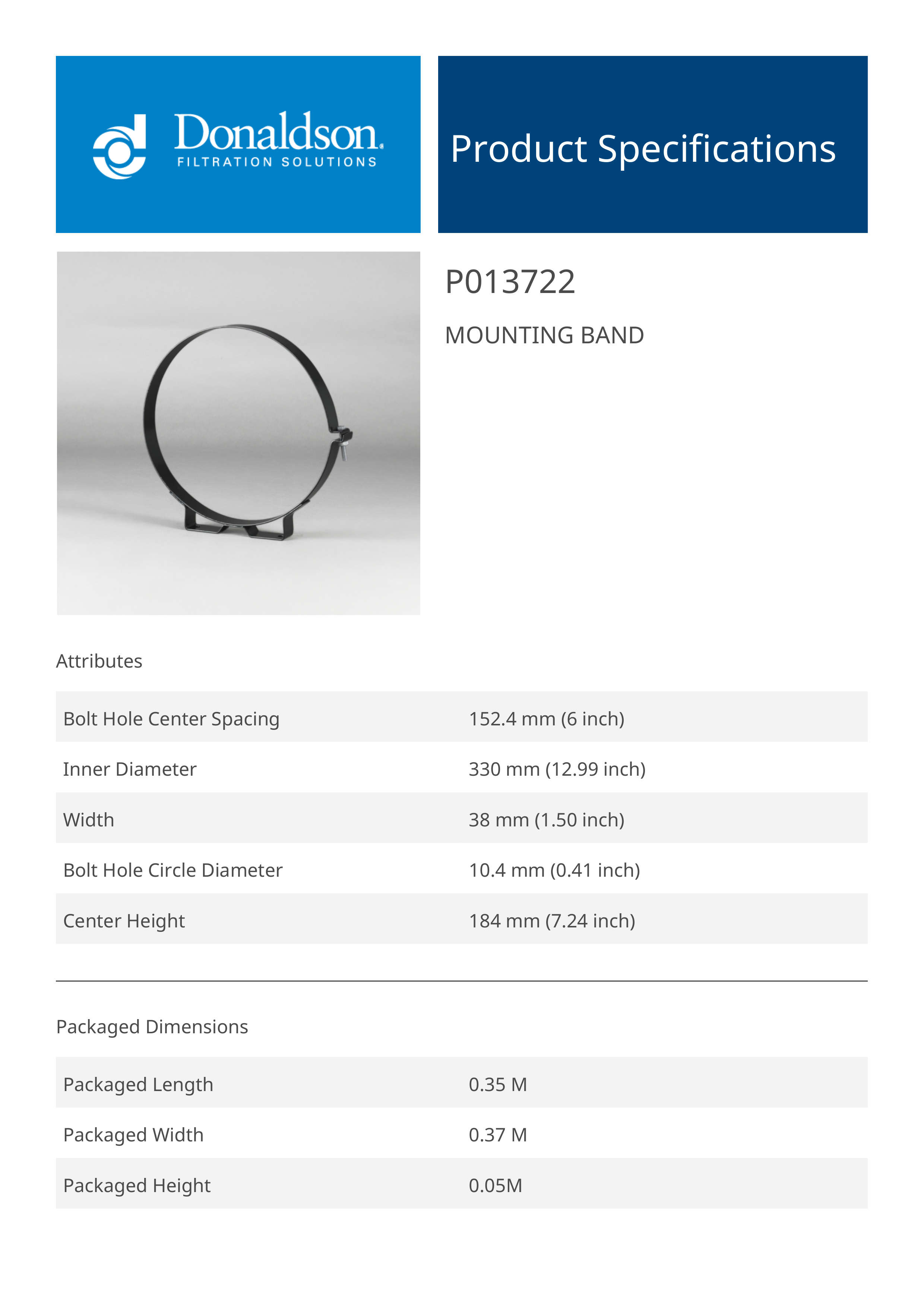 Genuine Donaldson P013722 Mounting Band is designed to provide reliable performance in mounting band applications. Built with high-quality materials, it ensures consistent functionality and durability.Ideal for industrial, automotive, or heavy-duty environments, this component enhances system performance and longevity.