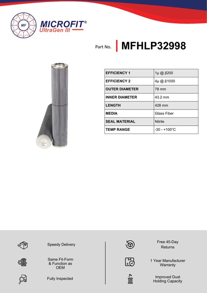 Genuine MICROFIT® UltraGen III MFHLP32998 Pressure Filter. Engineered and manufactured in Great Britain the MFHLP32998 is designed to meet or exceed the quality and performance of OEM quality standards, ensuring superior filtration performance and the longest possible filter life.Building on over 50 years of filtration expertise, the UltraGen III series is the third generation of MICROFIT® filter media, delivering exceptional efficiency and reliability.