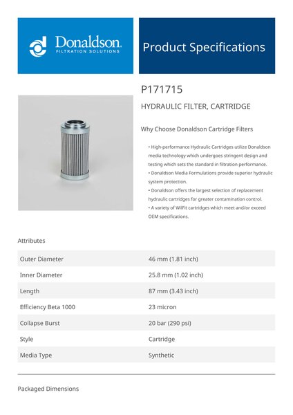 Genuine Donaldson P171715 Hydraulic Filter, Cartridge is designed to provide superior protection for your hydraulic system, effectively capturing contaminants to ensure clean fluid circulation. With high-quality filtration media, it extends equipment life, improves operational efficiency, and maintains fluid cleanliness even in the most demanding environments.