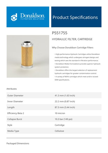 Genuine Donaldson P551755 Hydraulic Filter, Cartridge is designed to provide superior protection for your hydraulic system, effectively capturing contaminants to ensure clean fluid circulation. With high-quality filtration media, it extends equipment life, improves operational efficiency, and maintains fluid cleanliness even in the most demanding environments.