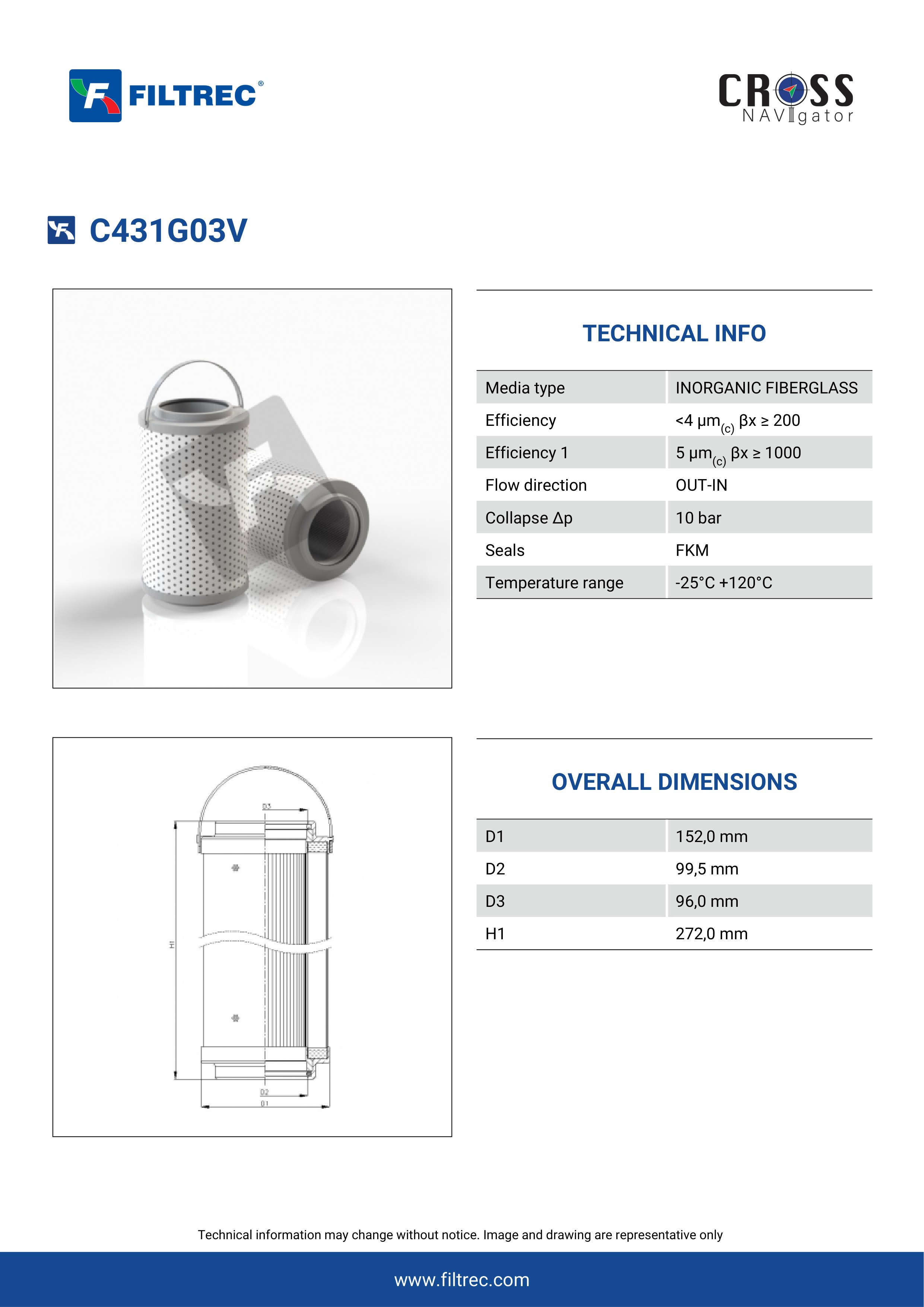 Genuine Filtrec C431G03V. This Filtrec element is designed to meet or exceed the quality and performance of brand OEM’s ensuring superior filtration performance and long-lasting durability.