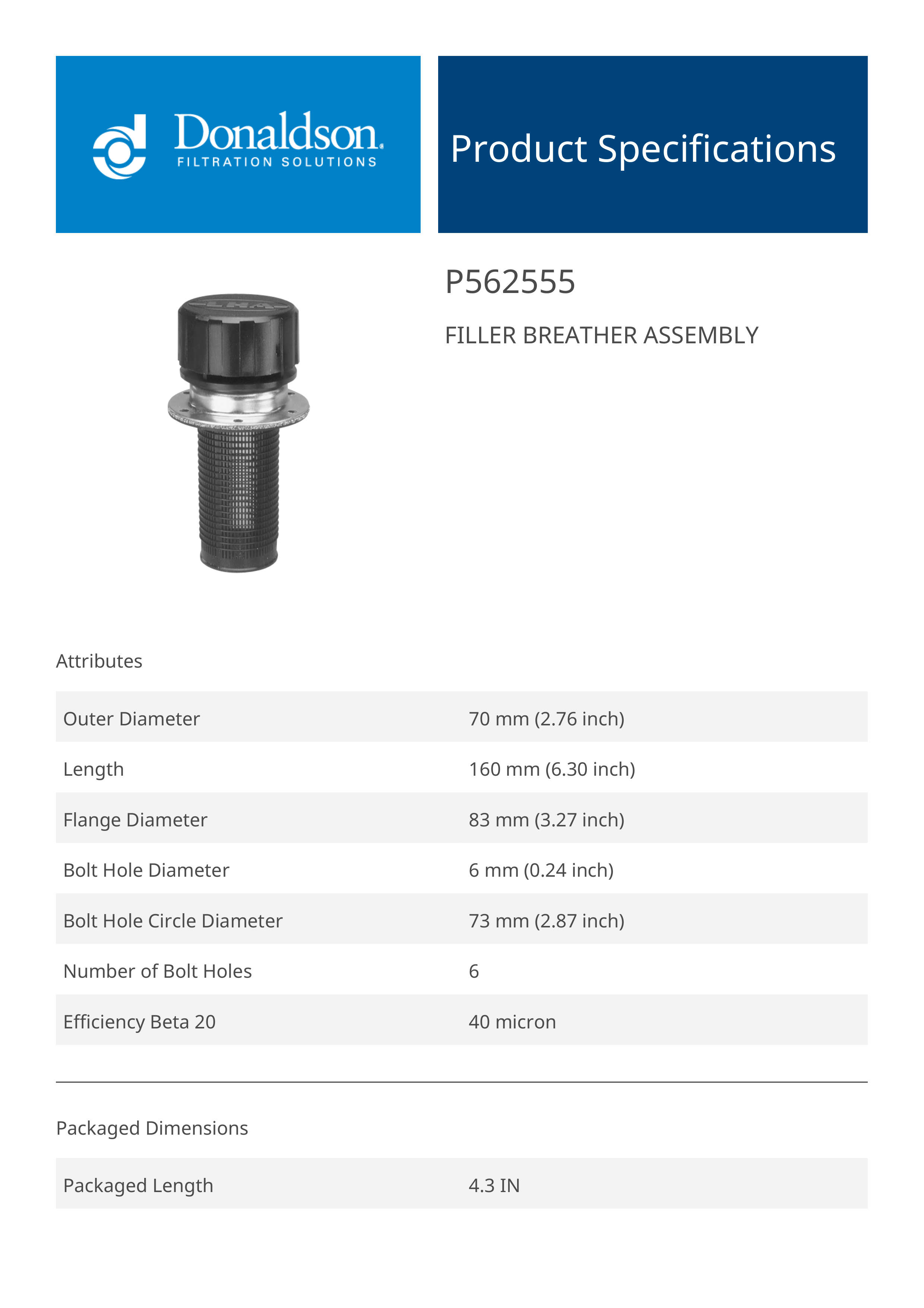 Genuine Donaldson P562555 Filler Breather Assembly is designed to provide reliable performance in filler breather assembly applications. Built with high-quality materials, it ensures consistent functionality and durability.Ideal for industrial, automotive, or heavy-duty environments, this component enhances system performance and longevity.